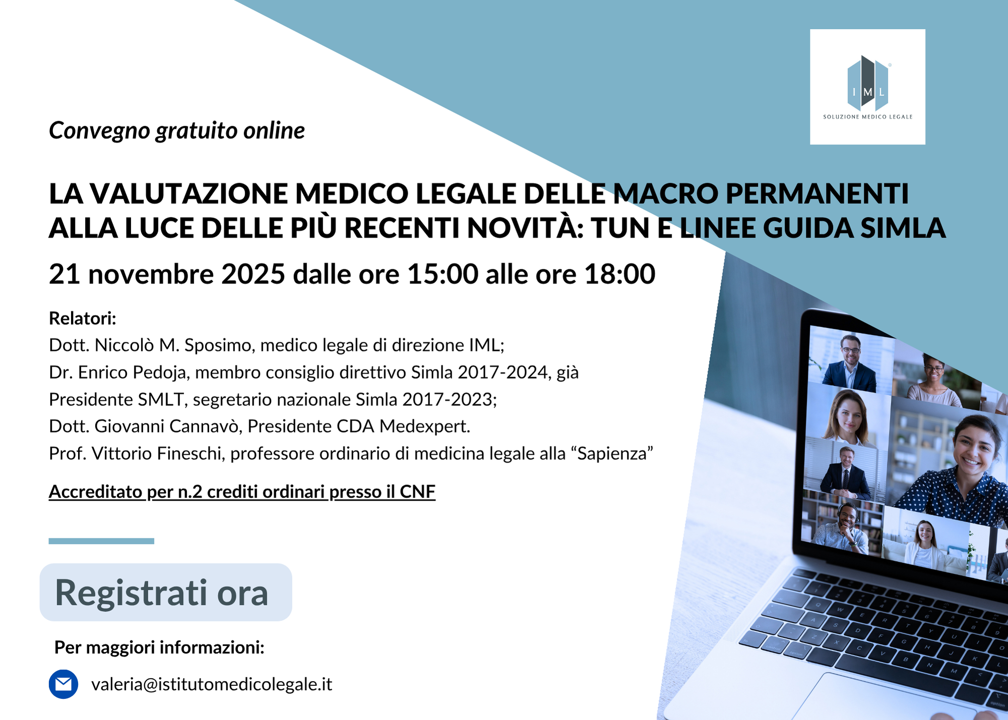 Nuovo webinar gratuito targato IML. Lunedì, 3 Maggio, alle ore 18:00, il nostro medico di direzione, il Dr Niccolò M. Sposimo parlerà, insieme alla radiologa forense, la Dr.ssa Maria Luisa Calabrese, di diversi temi che riguardano la figura del radiologo sia, in ambito infortuni, che in responsabilità professionale medica.