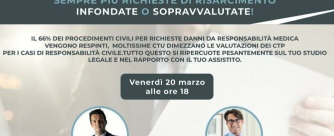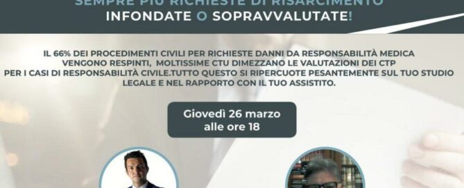 Giovedì 26 marzo alle ore 18:00 collegati al nostro Webinar per scoprire come ridurre il numero di richieste danni respinte e molto altro Il 66% dei procedimenti civili per richieste danni da responsabilità medica vengono respinti, moltissime CTU dimezzano le valutazioni dei CTP per i casi di responsabilità civile. Tutto questo si ripercuote pesantemente [...]